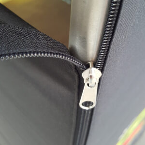 É um expositor publicitário portátil, fácil e rápido de montar.